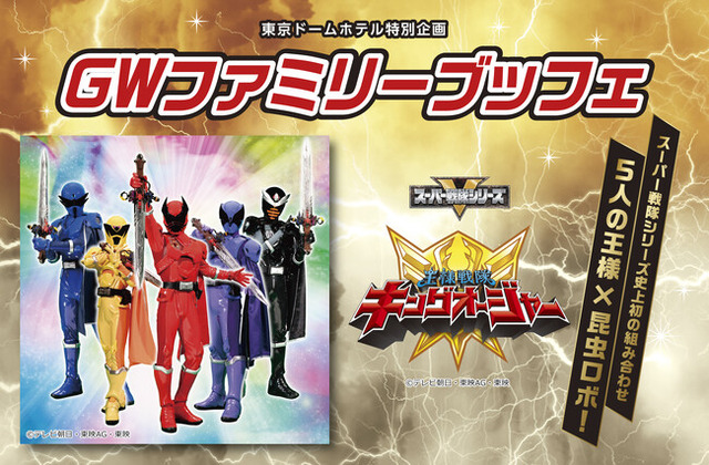 本イベントでは、「5人の王様×昆虫ロボ」というスーパー戦隊シリーズ史上初の組み合わせによる新ヒーロー「王様戦隊キングオージャー」(テレビ朝日系:毎週日曜日 9:30~)が繰り広げるアクション満載のステージと、ホテルシェフが手掛けるブッフェスタイルのお食事をご提供いたします。大人気のヒーローを目の前に“ワクワクがいっぱいのヒーローショー”と“バリエーションに富んだお料理”を、ご家族皆様でお楽しみください。