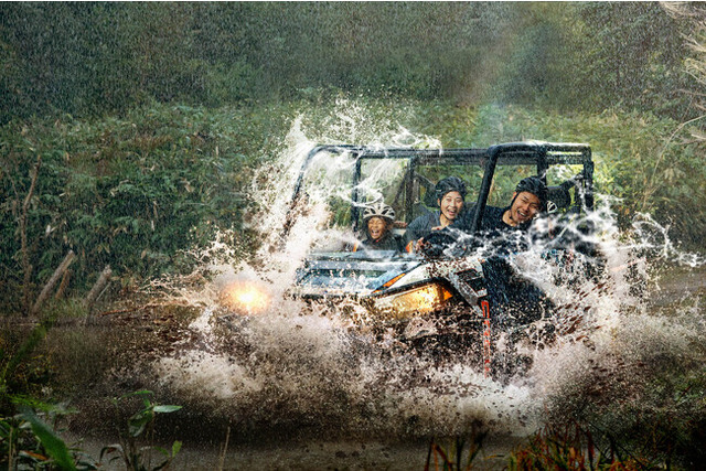 当アクティビティでは、リゾート内の森にある東西約6キロメートルにわたり、泥道や水たまりなどが点在する山道のコースを走行します。このコースの中には、より泥まみれになれる4つのスプラッシュポイントがあります。水が溜まったスプラッシュポイントはその深さを目視で確認できないので、止まることなく駆け抜けるには、バギーを運転するスピードが大切です。雨の日だからこそ、ドキドキ感を最大限に楽しむことができます。