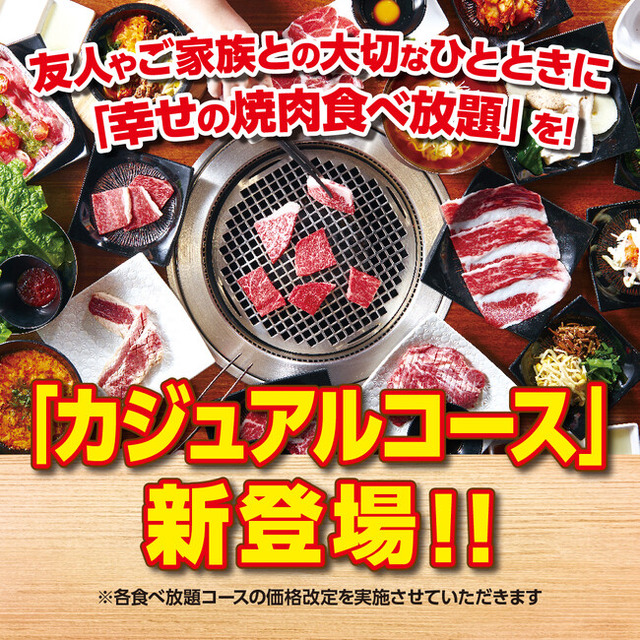 この度、販売を開始いたします「カジュアルコース」は、これまで「かみむら牧場」が提供しております3種の食べ放題コースよりさらに低価格コースで、食べ放題となる時間は100分で他のコースと変わらず、60品のラインナップに新鮮な野菜やナムル、デザートやアイスクリームがビュッフェ形式で食べ放題のKAMIMURA BARもセットで、おひとり様税込3,168円にてご用意しました。また、小学生は半額の税込1,584円、幼児は税込418円(3歳以下無料)で、さらに小学以下のお客様は食べ放題コースにドリンクバーが無料でセットとなっております。これにより、初めて「かみむら牧場」に脚を運ばれるお客様のお試しコースとしてはもちろん、ご家族でのご利用でもこれまで以上に気軽に焼肉の食べ放題をお楽しみいただくことができるようになります。