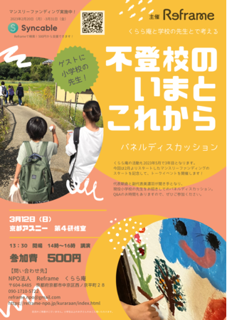 特定非営利活動法人 Reframe(所在地:京都市円町、代表:朝倉美保、以下、Reframe)は、2023年3月12日(日)京都アスニーにて様々な立場から子どもたちへのよりよりサポート体制をつくっていくために、居場所利用者の不登校児童の小学校担任の先生と共に「不登校のいまとこれから」のことを考えていくトークイベントを開催します。