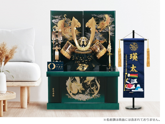 煌びやかな金色の兜と、勇ましい龍虎模様の金彩蒔絵を施した、収納飾りです。屏風と収納箱は、光の反射や見る角度によって、緑色から碧色へと色の変化が楽しめます。