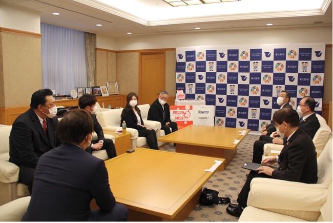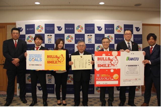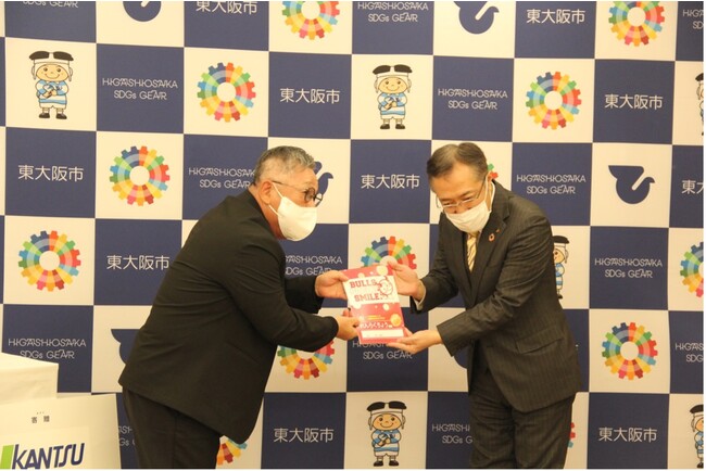贈呈式には大阪ゼロロクブルズ様より代表取締役 矢白木 崇行様、球団代表兼GM 谷口 功一様、球団監督 藤井 秀悟様、東大阪市より教育委員会教育長 古川聖登様、教育委員会教育次長 北林康男様、副市長 山本吉伸様が出席いたしました。