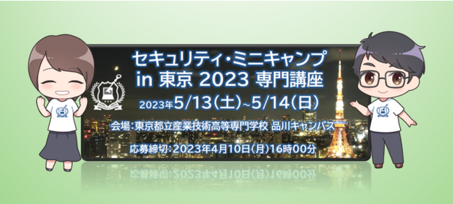 2023年5月13日(土)・14日(日)の2日間 現地開催にて東京都立産業技術高等専門学校、一般社団法人セキュリティ・キャンプ協議会、独立行政法人情報処理推進機構(IPA)が主催する「セキュリティ・ミニキャンプ in 東京 2023」の専門講座の参加者を募集いたします。
