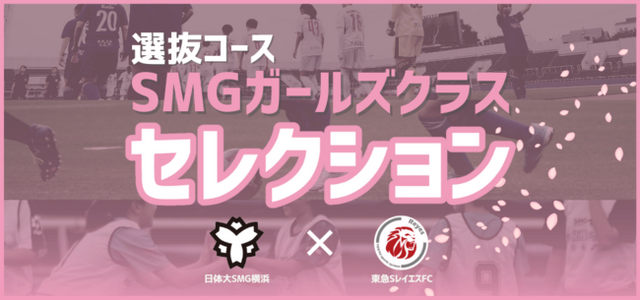 この度、SMGミライ応援プロジェクトの一環として、女子サッカー選手の競技力向上を目的に、日体大SMG横浜(なでしこ1部リーグ所属)と東急SレイエスFC(神奈川県3部リーグ所属)の両者がタッグを組み、たまプラーザ校にて選抜コースSMGガールズクラスの新設が決定いたしました。それに伴い、新小学4~6年生を対象とした『選抜コースSMGガールズクラスセレクション』を実施いたします。つきましては、下記より開催概要をご確認の上、是非ご応募ください。皆様のご参加を心よりお待ちしております。
