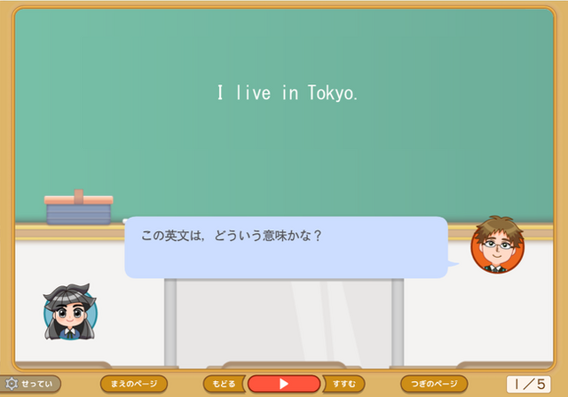 「レクチャー」では、学習内容をテキスト表示と音声での読み上げで、マンガを1コマずつ音声付きで進めるかのように、「すすむ」「もどる」等のメニューで進められます。