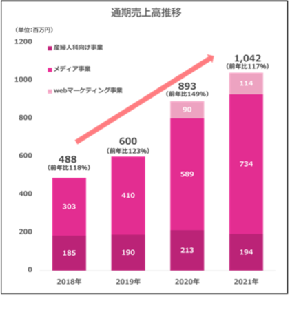 多くの医療専門家監修による、日本最大のPV数を誇る育児支援サイト「ベビーカレンダー」を運営。ベビーカレンダー以外にも、女性のライフスタイルにあわせた情報提供サイトを展開し、事業を拡大中。2021年に東証マザーズ上場。