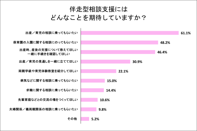制度の対象であるかどうかにかかわらず、会員ママ881名を対象に、伴走型相談支援に期待することを複数解答形式で尋ねたところ、回答の多かった順に「出産/育児に関する相談に乗ってもらいたい」61.1%、「保育園の入園に関する相談に乗ってもらいたい」48.2%、「出産時、産後の支援について教えてほしい/一緒に手続きを確認してほしい」46.4%、「出産/育児についての見通しを一緒に立ててほしい」30.9%などという結果になりました。