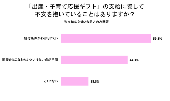 一方、「出産・子育て応援ギフト」の支給に際し、不安を感じていることを複数解答形式で尋ねると、解答の多かった順に「給付条件がわかりにくい」59.8%、「面談をおこなわないといけない点が手間」44.3%、「とくにない」18.3%という結果に。全体の4割のママが、面談に対する不安を抱いていることが明らかになりました。