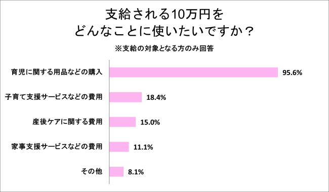 では、制度の対象であるママは、支給される計10万円をどのように活用したいと考えているのか、複数回答形式で尋ねたところ、結果は回答の多かった順に「育児に関する用品(ベビー用品)などの購入」95.6%、「子育て支援サービスなどの費用」18.4%、「産後ケアに関する費用」15%、「家事支援サービスなどの費用」11.1%。