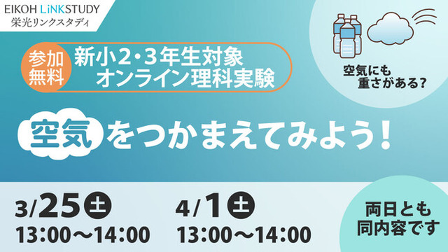 株式会社増進会ホールディングス(Z会グループ)のグループ会社、株式会社栄光(本社:東京都千代田区 代表取締役社長:下田勝昭)が運営するオンライン進学塾「EIKOH LiNKSTUDY(栄光リンクスタディ)」は、新小学2・3年生(現小学1・2年生)対象のオンライン理科実験教室「空気をつかまえてみよう!」を、2023年3月25日(土)・4月1日(土)に無料開催します。身の回りを取り囲む「空気」とは何か、実験を通して学びます。