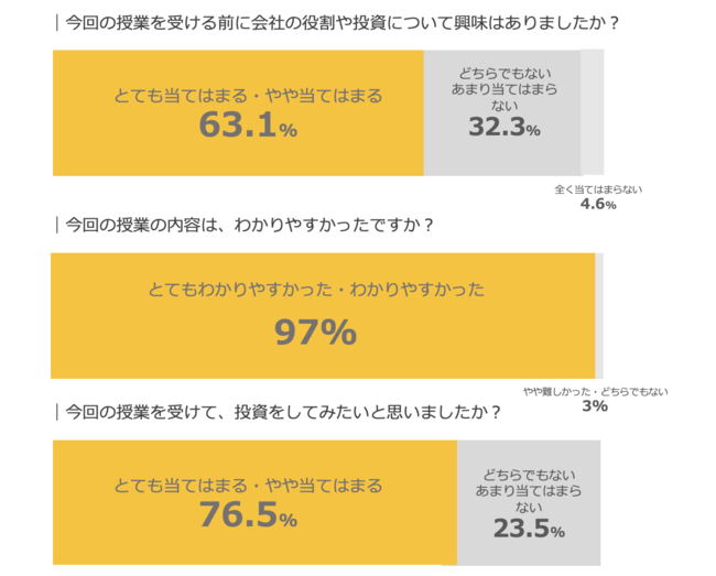 アンケートでは、授業を受講する前と後で会社や投資の仕組みについての関心や態度変容について回答してもらい、過半数が関心がある状態から97%が授業が「わかりやすかった」と回答しており「投資をしてみたいと思ったか」について過半数が「はい」を選びました。