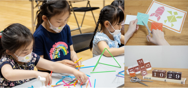 手を動かしながら楽しく工作に取り組んでいくなかで、算数のなかでも特に「図形」に対して学べる内容となります。工作のなかには、完成後も遊べる作品もあり、その場だけでなく、ご自宅での算数の学びにつなげることも可能です。