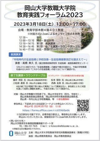 国立大学法人岡山大学(本部:岡山市北区、学長:槇野博史)の教職大学院ではこの度、岡山県内の学校教職員の皆様と岡山大学教職大学院の修了生・在学院生がともに、昨今の教育行政動向を踏まえた知識更新を図り、学校現場での実践的知見を共有するための場として、教育実践フォーラムを2023年3月18日(土)に現地開催とオンラインのハイブリッド形式で開催します。