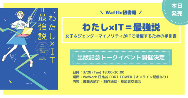 IT分野のジェンダーギャップ解消を目指す特定非営利活動法人Waffle(東京都港区、以下Waffle)は、本日3月8日(水)の「国際女性デー(International Women's Day)*1」に、プログラミング必修の時代に欠かせない、女子&ジェンダーマイノリティのための新しい進路応援ガイド『わたし×IT=最強説 女子&ジェンダーマイノリティがITで活躍するための手引書』をリトルモアより発売しました。