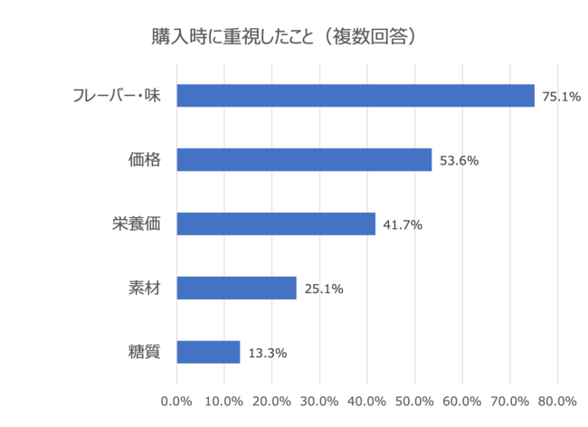 シリアルの購入時に重視したことは「フレーバー・味」 が75.1%と最多、続いて「価格」「栄養価」「素材」「糖質」でした(複数回答、上記グラフ)。