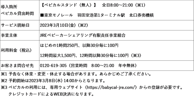 ◆今回、東京モノレール株式会社と連携し、3月10日(金)より、羽田空港第1ターミナル駅でサービスを開始します。空港駅での導入はベビカルとして初となります。