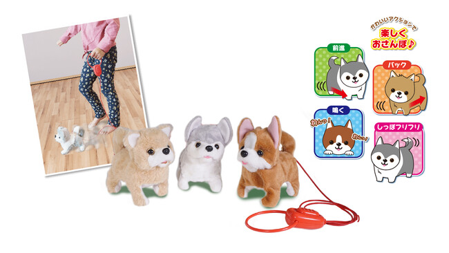 特徴:リードを持って一緒におでかけ。しっぽをフリフリしながらトコトコ歩く!ワンワンと鳴いて愛くるしさUP。リードを持ってわんちゃんの散歩を楽しもう。