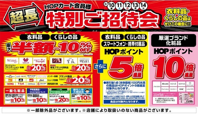 衣料品とくらしの品は、この5日間、最大半額から10%割引、また、均一価格やレジにて割引企画のほか、お買い上げ時のHOPポイント5倍進呈いたします。