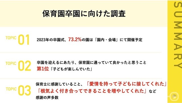 昨年まではコロナ禍の影響で開催見合わせも余儀なくされていた卒園式ですが、今年は一部でオンライン開催もあるものの、73.2%の園では園内や会場にてリアルにて開催予定だということが分かりました。保護者としては、「何よりも子どもが楽しく過ごすことができたこと」や、「生活に必要なことを身につけられたこと」、「社会性が育まれた」など、保育園に子どもが通う様々なメリットを実感していることが伝わってくる内容となりました。また、保育園全体や担当保育士に対しては、「愛情を持って子どもに接してくれた」や「根気よく付き合ってできることを増やしてくれた」など、感謝に溢れる言葉が多数寄せられました。