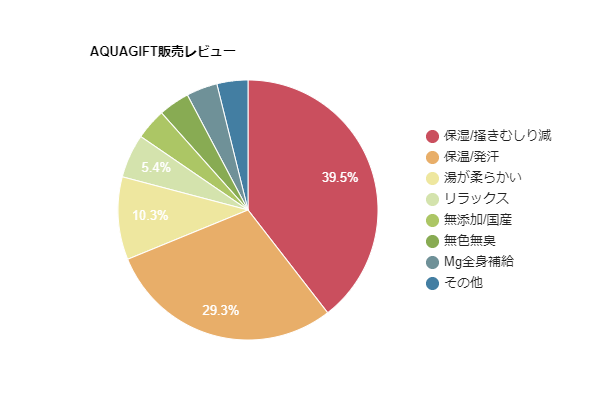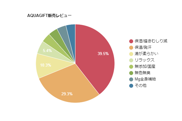累計販売数18個突破※を記念し、自社ECサイト、楽天、Amazonで「AQUAGIFT(アクアギフト)」をご購入いただいた方よりいただいている体験レビュー合計3800件を集計し、カテゴリーを分けてグラフ形式に致しました。(2023年2月現在) AQUAGIFT(アクアギフト)の特長の一つである、「お肌がしっとり潤った」「乾燥による搔きむしりが減った」とお肌に関する保湿効果レビューが最多となり、寒い季節には嬉しい「ぽかぽか温まる」「汗が出てくる」といった保温効果のレビューも多数いただきました。また敏感肌の方が「AQUAGIFT(アクアギフト)」をお風呂に入れる事で、「お湯がピリピリしなくなった」「疲れが取れリラックスして眠れる」といったご報告いただく体験レビューもありました。