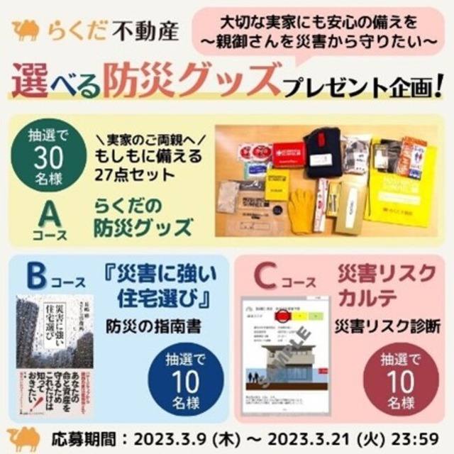 らくだ不動産公式Twitterアカウントをフォローの上、キャンペーン期間中にご応募いただいた方の中から、抽選で合計50名様に選べる防災グッズをプレゼントいたします。