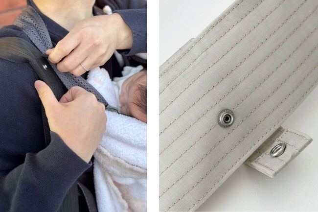 例えばベビーカーのアンダーバッグとして使うなど、2本の支柱があればベルトを固定でき、ワンタッチで取り外せる仕組みを取り入れました。(*付属のバックルを装着する際は、ベルトをきつく巻き付け固定し、常に安全性を確認してからご使用ください)
