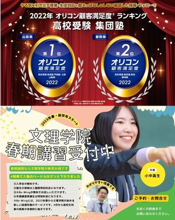 文理学院は1981年に山梨県で創業し、小学生から高校生までの学習指導を行っている総合進学塾です。現在は山梨、静岡両県にまたがり35校舎を展開しています。(2023年3月現在)。企業URL https://www.bunrigakuin.com/