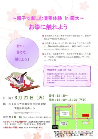 国立大学法人岡山大学(本部:岡山市北区、学長:槇野博史)の教育学部・大学院教育学研究科ですは、2023年3月21日(火・祝日)に、箏曲演奏家の山路みほ先生をお迎えし、親子のためのお箏のワークショップ「~親子で楽しむ演奏体験 in 岡大~ お箏に触れよう」を本学津島キャンパスの岡山大学教育学部北音楽棟で開催します。