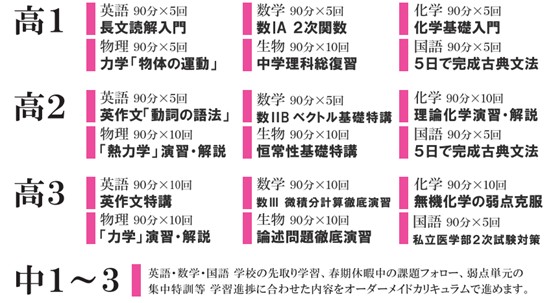 創業以来35年間積み重ねたノウハウを持った各教科のエキスパート講師が、生徒一人ひとりの現状の問題点をカウンセリングし、ベストな授業内容を提案する完全オーダーメイドカリキュラムです。自分にあった授業内容で、苦手単元を0から集中特訓することで、春からのスタートダッシュを叶えます。