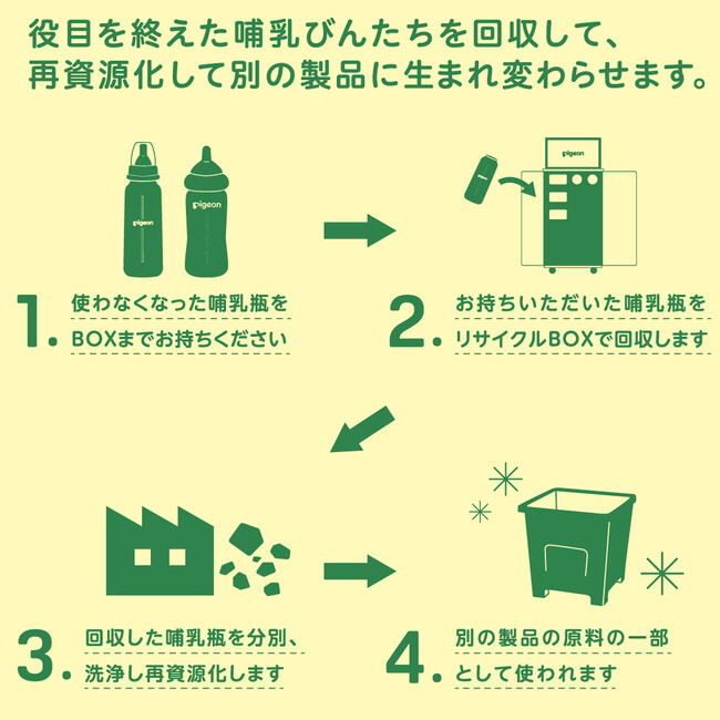 ・回収対象製品:ピジョンのプラスチック製哺乳びん・耐熱ガラス製哺乳びん、乳首、フード、キャップ(ピジョン製品以外は対象外です)。
