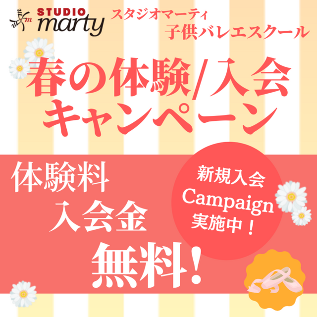 マーティ子供バレエスクールでは、ただいま初回体験レッスン&入会金無料キャンペーンを実施中です♪