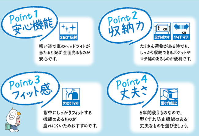 前後左右360゜『ピカっと反射』、荷物の量に合わせて調節出来る「最大8cmまで広がるポケット」、らくに背負える「ぴったりフイット」を、すべての商品に備えています。