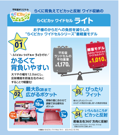 「ふわりぃ らくピカッ ワイドセル ライト」は、平和堂のランドセル平均重量より160g軽い1,010gと超軽量。