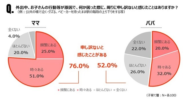 1. ママの8割、パパの半数以上が外出の際に子供の行動が原因で周りに申し訳ないと感じている。
