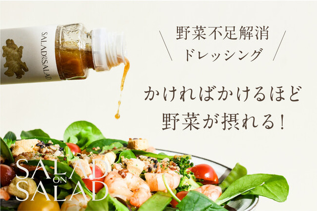 Salad on Salad はいつものサラダをもっと手軽に、栄養をアップできる新しい調味料です。定番の調味料に野菜を足すことで、野菜の風味を感じることができるだけでなく、食物繊維やビタミン、ミネラルといった野菜の栄養も摂ることができます。