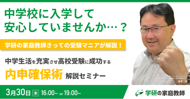 株式会社 学研ホールディングス(東京・品川/代表取締役社長:宮原博昭)のグループ会社、株式会社学研エル・スタッフィング(東京・高田馬場/代表取締役社長:伊藤弘雅)が運営する学研の家庭教師が「中学生活を充実させ高校受験に成功するための内申確保術セミナー」を2023年3月30日(木)に開催いたします。