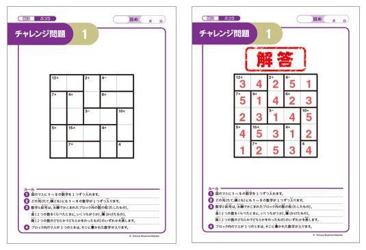 今回、読者の「パズルをもっと解きたい!」という要望に応え、基本レベルの「やさしい」5冊では収録パズルを増やしました。また、標準レベルの「ふつう」5冊には、購入者限定Web特典として、ダウンロードできるチャレンジ問題をつけました。書籍のパズルを解き終えたら、ぜひ、チャレンジ問題にも挑戦しましょう。プリントして、くり返し解くことができます。