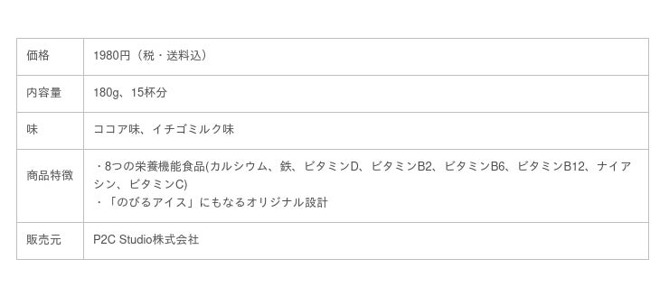 「のびろー」は牛乳150mlに12g(大さじ約すり切り2杯)を混ぜて飲む、粉末状の成長サポート飲料です。一杯で一日分のカルシウムが摂れるだけでなく、鉄分や7種類のビタミン、更に「そだつ乳酸菌(R)️」が1,000億個も入っており、8つの栄養素を含む栄養機能食品として多角的にお子さんの成長をサポートします。また、鉄分が気になるお母さんや、食事の栄養バランスが偏りがちなお父さんにもオススメなアイテムです。