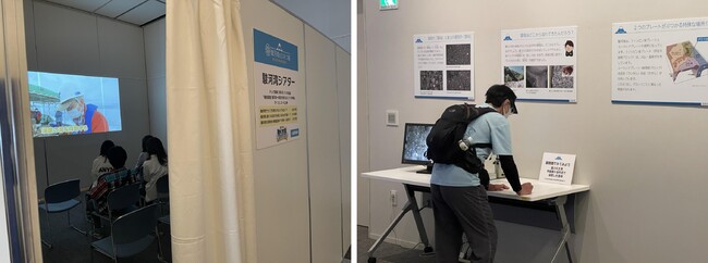2つ目は駿河湾の地形のコーナーでは複数のプレートの影響で、駿河トラフと呼ばれる深い湾ができたことや、急峻な富士川の流れが駿河湾の深海にまで及んでいることが説明されています。実際に駿河湾の立体模型や富士川の流れの影響を示す雲母など顕微鏡の画像を観察することができます。