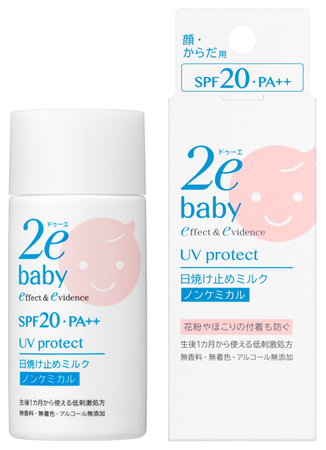 「ドゥーエ ベビー 日焼け止めミルク」は、赤ちゃんの肌を紫外線から守るだけではなく、均一膜プロテクト技術により、花粉、チリ・ほこりなどの微粒子が肌に付着するのを防ぎます。また、うるおいバリアサポート成分(キシリトール)配合でデリケートな肌を乾燥から守ります。
