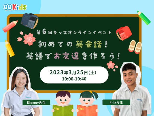 株式会社QQEnglish (本社:東京都渋谷区、代表取締役:藤岡 頼光)は、無料のオンラインセミナー 第6回キッズオンラインイベント「はじめての英会話!英語でお友達を作ろう!」を2023年3月25日(土)に開催します。QQキッズの会員・非会員を問わず参加できる無料のオンラインイベントです。ぜひご参加ください!