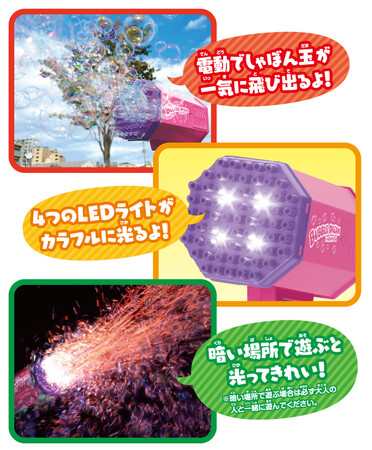 トリガーを引くと69個のノズルから約3,000個のしゃぼん玉が飛び出ます!今までなかった、超大量のしゃぼん玉が最高に楽しい電動しゃぼん玉玩具です!公園や空き地、お庭で、家族や友達と一緒にみんなで楽しもう!商品はブルーとピンクの2種類。好きな色のしゃぼんドリームで遊ぼう!しゃぼん玉液が無くなった場合は市販のしゃぼん玉液をご使用ください。