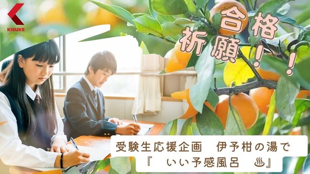 四国最大級の総合エンターテイメント企業・キスケ株式会社(本社:愛媛県松山市、代表:山路義則)の運営する温浴施設「喜助の湯」は受験生の皆さんに、合格への道を応援する特別企画が登場します!3月17日(金)から3月19日(日)の3日間、『いい予感風呂』が開催されます。このイベントは、受験生の合格を祈願し、リラックスして合格発表に臨むためのものです。期間中、受験票を提示することで入浴料が無料になりますので、この機会にぜひお立ち寄りください。 伊予柑の湯で心身ともにリフレッシュし、合格へのいい予感を感じていただくことを願っています。受験生の皆さんが最後まで諦めず、力を発揮できるよう願っております。