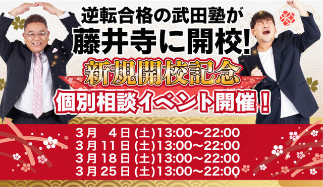 武田塾藤井寺校の開校を記念して、藤井寺校では個別相談イベントを実施いたします。