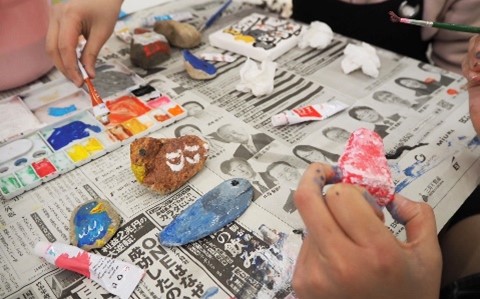 プロアーティスト山森冬美氏と共に行うアート体験。第一回目は子どもたちが高尾の自然である「石」を探し集め、自分の好きな石をキャンバスにしてアクリル絵の具でアートを施し、自分だけの作品を創ります。