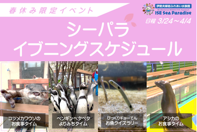 伊勢シーパラダイスは、春休み限定夕方特別イベントとして「シーパライブニングスケジュール」を3月24日(金)~4月4日(火)まで実施します。