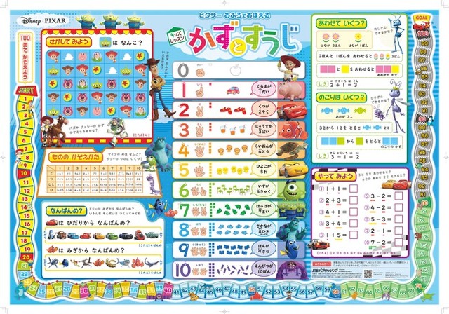 ピクサーの仲間たちと一緒に楽しく数と数字を覚えられます。算数学習の入門編にぴったりです。