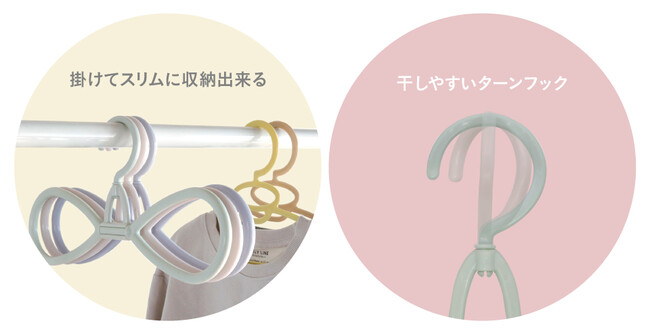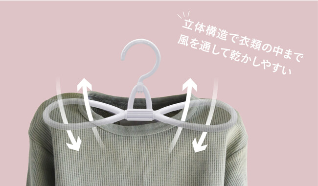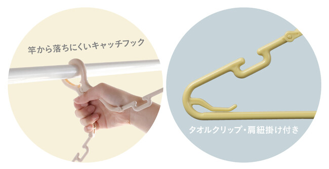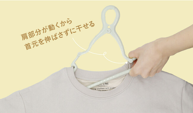 肩部分を掴むとコンパクトになるので、首元を伸ばすことなく干せ、肩紐掛けやタオルクリップ付きなので幅広い使い方が出来ます。