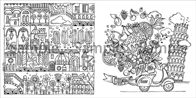 はっきりとしたラインに縁取られ、彩り豊かな国々の風景を楽しむことができます。さあ、魅惑的なヨーロッパの国々にいっしょに旅立ちましょう!