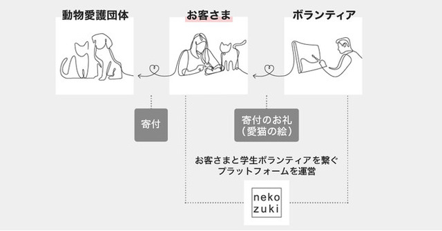 絵を描くのが好きなボランティアの大学生が、寄付の返礼として愛猫の写真を見ながら、飼い主のために絵を描き、届けます。寄付は動物愛護団体の動物たちのために使われるので、救える命が増えるという取り組みです。